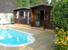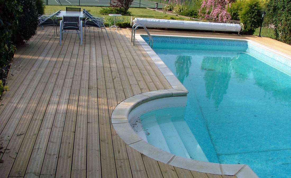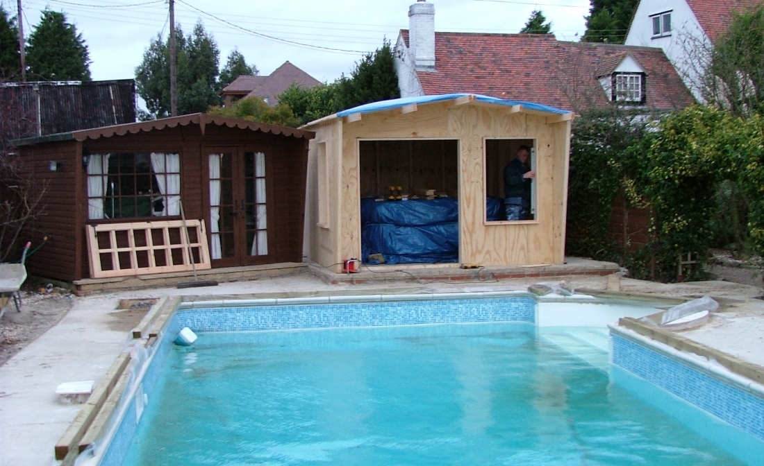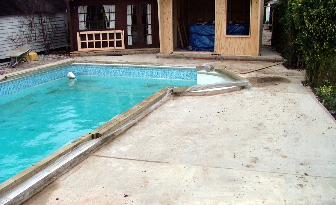 Our client selected us to deck the pool area and create an enclosure for a hot tub to match the pool house.